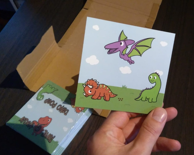 Dinosaur birthday cake with matching invitation folders and treat bag.