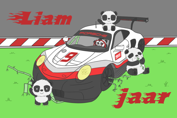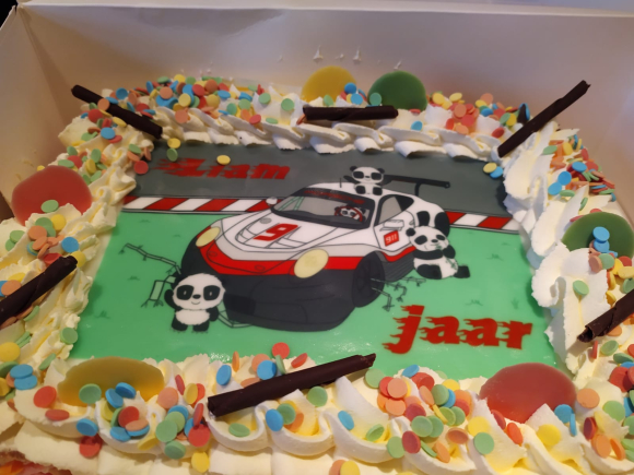 Designed a birthday cake for a panda/race car fanatic.